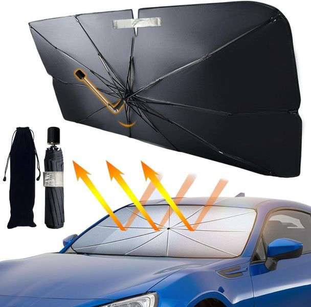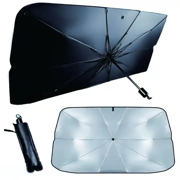 این محصول برای هر گونه محافظت در برابر نور خورشید عالی است.طراحی شده با پارچه محافظ UV طراحی هوشمندانه این چتر (sun shade umbrella) نگران افتادن آفتاب گیر از شیشه جلو خود نباشید و آفتابگیر شیشه جلو چتری دارای ده دنده فولادی است که به خوبی پشتیبانی و از سقوط جلوگیری می کند.طراحی تلسکوپی آفتاب گیر، باعث شده این محصول استفادهای آسان داشته باشد و باز و بسته کردن آن سریع و بدون زحمت باشد.طراحی فوقالعادهای ک با پوشش ضد آفتاب روکش نقره به شدت نور خورشید را منعکس می کند و دمای داخل خودرو را کاهش می دهد و از خودروی شما محافظت می کند.سایبان ضد آفتاب ابزاری کاربردی برای محافظت از داخل خودرو در برابر نور UV و کمک به کاهش دمای داخل ماشین است.